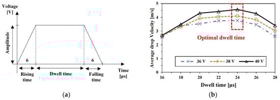 The typical trapezoidal waveform was applied to operate the piezoelectric actuator, as shown in Figure 4a. The rising/falling time and dwell time of the waveform were similar to those of the previous study using the same model of the inkjet head [27]. According to the previous studies and pressure wave propagation theory [28], the dwell time would have an optimal value that appears when the wave is amplified by pressure wave overlapping, termed resonance. The optimal pressure wave condition for the return of the actuator to the initial position can be determined when the negative pressure wave generated by the pull of the actuator is positioned at the center of the actuator after being reflected at the inlet of the nozzle. With this condition, the return of the piezo actuation generates a most amplified positive wave, and the maximum energy can be delivered to the meniscus for jetting. Thus, the speed of the acoustic pressure wave should be known to determine the resonance condition and optimize the dwell time. The traveling time of the pressure wave was calculated by the dimension of the nozzle structure and the properties of the experimental ink. The optimal dwell time could be obtained by the experiments as 24 μs, as shown in Figure 4b, whereas the calculated optimal time was 21 μs. The difference between the calculation and experimental result may occur by the geometrical deviation of the individual nozzle.
