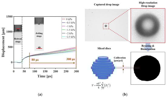 The built-in image-processing tool of MATLAB was utilized for the analysis of the jetting drops and meniscus. The recorded grayscale images of jetting, as shown in Figure 5, were obtained to recognize the boundary of the liquid ink. Sauvola’s method [29], which shows good performance for circular targets with background intensity gradient, was adopted as a binarization method. Binarized images were resized to enhance resolution by the bicubic interpolation method. Those high-resolution binary images were used to analyze the volume and velocity of the jetting droplets and the motion of the meniscus. The average velocity was calculated at the section where the linear displacement was observed after the pinch-off, as shown in Figure 5a,b, which depict the volume calculation method for the total volume of each sliced disc obtained through pixel-wise slicing and rotating the captured two-dimensional droplet image. Meniscus motion was measured from the beginning of the piezo actuation until the return to the stationary state. The negative sign of the meniscus displacement means the position inside the nozzle, while the positive sign means the position outside. The uncertainty of experimental measurements was also analyzed. The uncertainty occurs due to the pixel classification of binarization in the image processing, and the limit of the error is 0.292 μm. All experimental measurements are repeated three times. For all voltage and pressure control cases, the average uncertainty of the volume and velocity measurements are 0.511 pL and 0.0632 m/s, respectively. In the velocity measurements, there would be uncertainty for the temporal acceleration included.