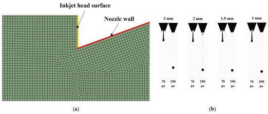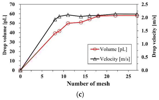 A mesh convergence study was conducted for accurate and economic calculation. Quadrilateral meshes were dominant over all domains, and the triangular mesh was partly generated around the curvature, as shown in Figure 7a. Meshes with a maximum size of 3 μm were generated in the nozzle chamber, and fine meshes were generated in the vicinity of the orifice and along the route of the flight of the droplet, where accurate calculations are necessary for the multiphase interface. According to the size variation of the mesh, the number of meshes at the nozzle orifice was controlled. The criteria of mesh convergence are the volume and velocity of the droplet. Figure 7b shows example images that were used to calculate the volume and the velocity. In each case, the maximum extrusion images are shown on the left, and images of the jetting droplet at 300 μs are on the right side. Figure 7c shows the result of the convergence study. As the number of the meshes at the orifice goes over 18, both the volume and velocity of the droplet converge. For accuracy of calculation, finer meshes were generated considering higher jetting velocity as voltage increases.