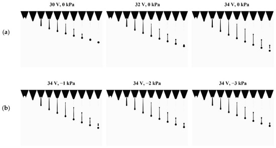 The negative pressure control has a strong advantage for the reduction in the ejected volume, while there is a weak disadvantage for the drop velocity. For example, in the experiment, the maximum velocity drop was 0.49 m/s, 13.46% less than the uncontrolled case at 34 V, which is not critical to the precision of impact. However, the maximum volume reduction of 18.96 pL, which was 20.25% less than the uncontrolled case, was considerable if the droplets were accumulated. Although the negative pressure control slows down the drop velocity and weakens the straightness of flight, it gives more benefit to the improvement of high-resolution printing, which enables the printing process to be elaborate. Furthermore, the negative pressure control enhances stability by suppressing the generation of the satellite drops. It is determined that, as the controlled pressure decreases, the distance between the head and tail parts reduces, as shown in Figure 9. Thus, it takes less time to coalesce, and the breakup is less likely to lead to the generation of satellite drops. The pressure control affects both the jetting characteristics and the meniscus movement. In the next section, the meniscus motion is tracked and analyzed to account for the stability enhancement by the damping enhancement effect of the pressure control.