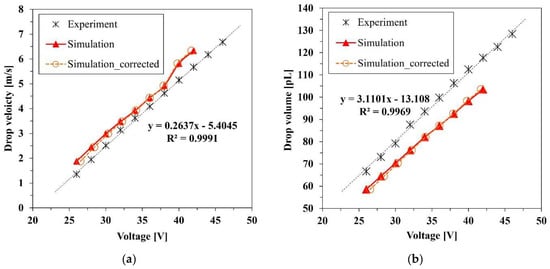 Figure 10a shows the results of the droplet velocity. The driving voltage was varied with the interval of 2 V in the range 26–46 V for the experiment and the numerical calculation. Both experimental and numerical results indicate that as voltage increases, the velocity increases linearly. The same tendency is also shown in previous studies [20]. In the experimental result, the minimum and maximum velocities were measured as 1.35 and 6.61 m/s at 26 and 46 V, respectively. The maximum and minimum velocities of the simulation were calculated as 1.87 and 6.33 m/s at 26 and 42 V, respectively. The volume of the droplet also features a linear relationship with the voltage, as shown in Figure 10b. In the experimental result, the minimum and maximum volumes were measured as 66.61 and 128.36 pL at 26 and 46 V, respectively. The numerical result shows that the overall volumes were approximately 10 pL less than those of the experimental result at the same voltage. The discrepancy appeared due to the backflow of the ink into the supply inlet. The flow resistance of the inlet needs to be carefully controlled. The minimum and maximum volumes were calculated as 58.53 and 103.47 pL at 26 and 42 V, respectively. The volume of the droplet is proportional to the deformation of the bulk piezoelectric actuator, which is linear to the driving voltage. The amplitude of the voltage with the same rising and falling time determines the rate of volume change in the nozzle channel, which induces the volume flow rate. As a result, the voltage has a linear relation with both the velocity and the volume of the ejected droplets. Although, because of the generation of the satellite drop, the simulation results tended to be away from the tendency over 40 V, the overall results exhibited a linear relation in both the numerical simulation and experiment.