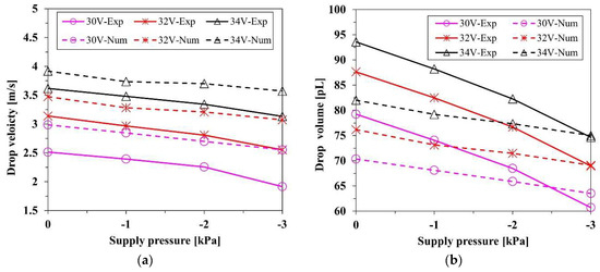 Figure 11 exhibits the velocity and volume of the droplets according to the supplied pressure at 30, 32, and 34 V. Both experimental and numerical results show that as negative pressure increased, the velocity decreased because the force exerted in the opposite direction of the jetting reduced the momentum and flow rate of the ink. The suppression of the momentum and mass flow rate resulted in the reduction in the velocity and volume of the droplets. At the maximum negative pressure of −3 kPa, the average droplet velocities reductions were 0.558 and 0.392 m/s for the experiment and numeric simulation, respectively, which were 18.7 and 11.6% less than the uncontrolled case of 0 kPa, respectively, where the supply pressure was the same as atmospheric pressure. At the maximum negative pressure, the average droplet volume reductions were 18.7 and 6.97 pL in the experimental and numerical simulation, which were 21.7 and 9.17% less than in the uncontrolled case, respectively. The velocity reduction rate in the simulation result was not much different from that of the experiment, while the volume results of the experiment decreased more rapidly than did the simulation. This might have occurred owing to the limitation of the calculation for interfacial dynamics. The velocity of a droplet is highly dependent on the momentum of the axial direction internal flow. Therefore, the effect of the pressure control on the axial direction flow momentum in the nozzle channel appears to be well simulated. Despite the significance of interfacial dynamics in determining the interfacial shape and the volume of the droplets, some factors, such as the anchoring of the meniscus and the dynamic contact angle, are not modeled in this simulation. Therefore, the empirical data by measurement were applied to develop the numerical model.