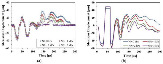 Figure 12 shows the experimental and numerical results of the meniscus motions. Residual vibration is the fluctuation of the meniscus that lasts until the movement of the meniscus returns to the initial stationary state by the damping of the fluid after the jetting. After pinch-off, the hemisphere liquid column appears at the orifice, like a tongue shape, due to the inertia of the jetting, as shown in Figure 8 after 130 μs. Then, the vibration arises on that column by the propagation of the acoustic pressure waves. Those pressure waves have remained and traveled after jetting until the energy is totally dissipated. At once, the interface gradually moves inward in response to the force exerted by the pressure difference between ink and ambient air and tends to be located at the initial position, the orifice edge. Accordingly, if the negative gauge pressure of the supplied ink suppresses the residual vibration, it was expected that it would take less time to make the meniscus return to the initial state. To verify the damping effect of residual vibration, the profiles of the meniscus displacement were analyzed over time. Figure 12 shows that in both the experiment and numerical simulation results, displacements of the meniscus show the same aspect of motion. After pinch-off, there are three peaks of the residual vibration, and the amplitude is attenuated by viscous damping. In particular, a significant reduction in the termination time of the residual vibration was observed. Figure 12a shows the measured displacement of the meniscus at 40 V. Without pressure control, the residual vibration lasted until 292 μs, whereas at maximum pressure control, −3 kPa, the termination time decreased to 200 μs. Thus, by the pressure control, the operation time of one jetting cycle decreases by 92 μs, 31.5% less than that of the uncontrolled case. Likewise, as shown in Figure 12b, the residual vibration of numerical calculation lasted until about 300 μs without pressure control and the termination time decreased by 188 μs at 30 V with the maximum pressure control, 3 kPa. Although the driving voltage of the numerical simulation, 30 V, is smaller than that of the experiment, 40 V, the result of the numerical simulation shows good agreement with the experiment quantitatively and qualitatively for the approximate termination time, and especially for the damping of the residual vibration by pressure control. The termination of the residual vibration is necessary to prevent the next cycle of jetting from failure. Therefore, a decrease in the duration time of the residual vibration would be considered the early formation of the stable condition of the initial state. In addition, through numerical simulation, the internal motion of the meniscus in the vicinity of the orifice could be observed more clearly, which is hard to capture owing to optical obstacles, such as reflected light and shadows.