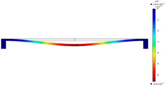To better illustrate the relationship between the resistance change of the piezoresistive beam and the measured voltage, according to Equation (6), the relationship between the axial strain of the piezoresistive beam and the amplitude of the measured voltage was analyzed by using COMSOL finite element simulation software. The simulation model was established as shown in Figure 1, applying the measured voltage above the grounding diaphragm. The boundary conditions were applied to the model, and the simulation results were obtained after meshing and calculation, as shown in Figure 5.