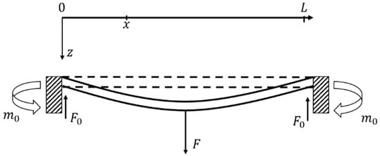 where is the length of the beam at rest, is Young’s modulus of the beam, is the moment of inertia of the beam, and is the loading force at the middle of the beam as shown in Equation (2). The aggregate axial strain induced by the deflection of the beam is given by [17]: