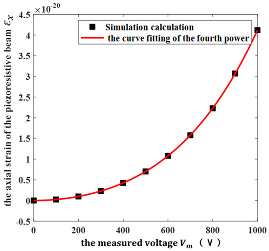 It can be seen from Figure 5 that the axial strain of the piezoresistive beam was proportional to the fourth power of the measured voltage. In addition, according to Equation (6), the change in the resistance value of the piezoresistive beam is linear with the axial strain of the piezoresistive beam; therefore, the change in the resistance value of the piezoresistive beam was proportional to the fourth power of the measured voltage, which was in good agreement with the theoretical model.