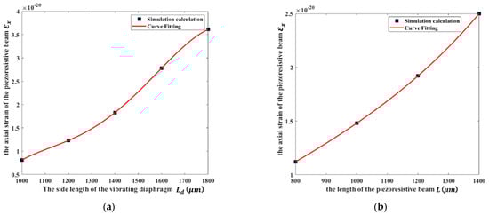 The simulation results between the axial strain of the piezoresistive beam and the parameters of the sensor structure: (a) the side length of the vibrating diaphragm; (b) the length of the piezoresistive beam.