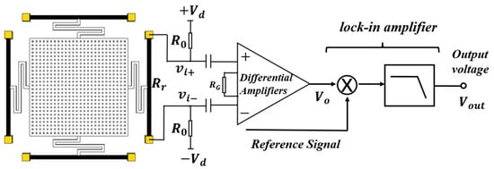 From the above equations, the output voltage is proportional to the change in resistance of the piezoresistive. According to Equation (8), the output voltage contains a DC component, the second-harmonic component, and the fourth harmonic component. Therefore, a lock-in amplifier was used to measure the second-harmonic component to obtain higher sensitivity and reduce noise. The amplitude of output voltage is proportional to the fourth power of the measured voltage.