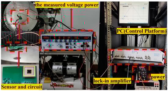 The test system was composed of a power section, the measured voltage power, a lock-in amplifier, a PC, and the measurement circuit, as shown in Figure 10. The power section was used to provide a DC voltage to the circuit, and the voltage was 5 V. The positive terminal of the measured voltage power was connected to a metal pole plate, and the negative terminal was common ground with the circuit. In order to verify the performance of the sensor, the sensor was encapsulated in ceramic and inverted on the metal plate, to which the measured high voltage source was applied. A high-voltage source was a high-precision-power YOKOGAWA 2558A instrument. The high-precision-power YOKOGAWA 2558A was used as the measured voltage power to provide AC voltages in the voltage range of 0–1200 V at the frequency range of 40–1000 Hz. Therefore, the measured voltage caused the deflection of the piezoresistive beam because of the electrostatic force between the vibrating diaphragm and the measured voltage. An HF2LI lock-in amplifier was used to measure the second-harmonic component of the output signals.