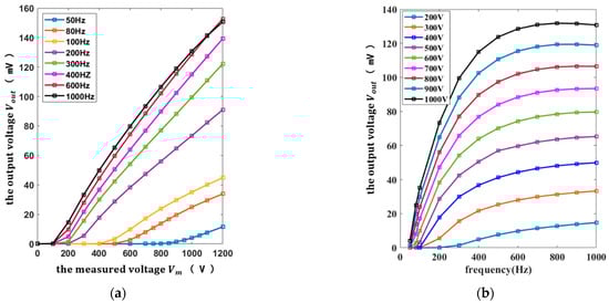 According to Figure 11, the output voltage was linearly proportional to the voltage measurement range of 900–1200 V at the frequency of 50 Hz, the voltage measurement range of 400–1200 V at the frequency of 200 Hz, the voltage measurement range of 300–1200 V at the frequency of 500 Hz, and the voltage measurement range of 200–1200 V at the frequency of 1000 Hz separately, as shown in Figure 13.