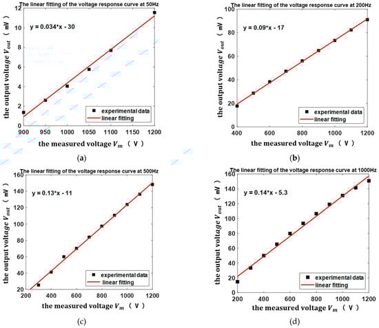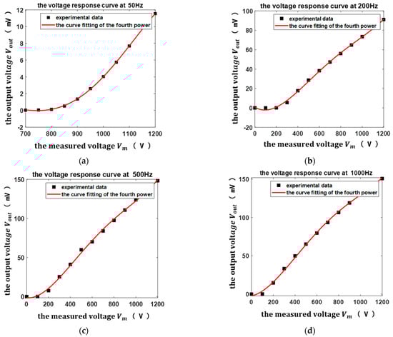 It can be seen from Figure 11a that there was a non-linear relationship between the sensor output voltage and the measured voltage, and the sensor output voltage increased with the measured voltage. To explain the relationship between the output voltage and the measured voltage more clearly, the voltage response curves of the sensor at the frequencies of 50 Hz, 200 Hz, 500 Hz, and 1000 Hz are curve-fitted, as shown in Figure 12.