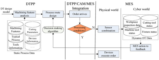 - Whether this decision result can guide the actual production needs to be judged in conjunction with the dynamic DT data of the workshop. This process integrates DTPP, CAM, and MES systems. If the production conditions meet the processing requirements, the process command is executed by the devices. If not, the MES system feeds back the DT data to the DTPP system to modify the process route.
