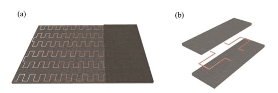 Recently, there has been a variety of advancements in developing flexible heaters based on stretchable polymers with conductive compositions []. For example, a metal nano network [], copper-plated fibers [] and graphite [] as flexible heaters have been investigated. However, the slippage of fiber in these heaters will result in higher electrical resistance in the local position under deformation, which causes extraordinarily higher temperatures at this point (i.e., called “hot spots”) []. To avoid this problem, periodical metal wire as a heat source was developed in flexible heaters. Jang [] investigated a stretchable and uniform Kirigami heater for heating the wrist and elbow with large motions, where aluminum-doped conductive paper is processed into a stretchable shape. Chen et al. [] adopted a copper mesh heat source as a skin patch for thermotherapy, which was shown to be highly conformable to the skin at high stretching.