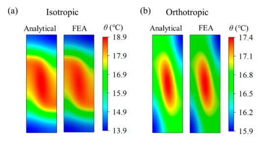 As a wearable heater in the future, the temperature distribution on the bottom surface of the substrate is noteworthy because it is in contact with the target object, such as the skin. Figure 3 shows the thermal fields at the bottom surface in a quarter of the unit cell (as shown in Figure 2b), which are calculated using Equation (17) based on the linear superposition of the surrounding heat source. Figure 3a shows the comparison of the temperature field between the analytical and FEA in a quarter of the unit isotropic cell with ksx = ksy = ksz = 0.17 W/m/K in the substrate. It can be seen that the temperature distribution is uneven along the y-direction because of the larger spacing W1 between serpentine heat sources. In general, the designed vertical space W1 is larger than the horizontal space W2 if the stretchable design of structure is along the horizontal direction (Figure 1), because most of the structures will shrink along the vertical direction based on the positive Poisson’s effect under horizontal stretching. To improve the temperature uniformity, the ksy is set as 1.7 W/m/K and other parameters are fixed, which is based on the different materials in the substrate laying along the y-direction (i.e., off-plane direction) in Equation (1). Figure 3b illustrates that the orthotropic substrate with higher ksy has a positive influence on the temperature uniformity, which is validated by FEA.