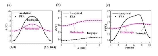 In order to show more direct comparison results, the temperature distributions along the different paths on the bottom surface of a quarter of the unit cell based on the isotropic and orthotropic substrate are shown in Figure 4. The temperature increase on the line starting from the coordinate origin (0, 0) to the coordinate (3.2, 10.4) of the upper right corner of a quarter model is calculated in Figure 4a, which includes the maximum and the minimum temperature in the model. It can be observed that the orthotropic substrate with higher ksy effectively reduces the temperature difference. From Figure 4b, the temperature difference between the isotropic and orthotropic substrates is close along the x direction (y = 2.5 mm); nevertheless, there is a great difference along the y-direction (x = 0), as shown in Figure 4c. This is because the higher thermal conductivity ksy in the y-direction can help obtain the uniform temperature distribution along the vertical space W1.