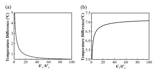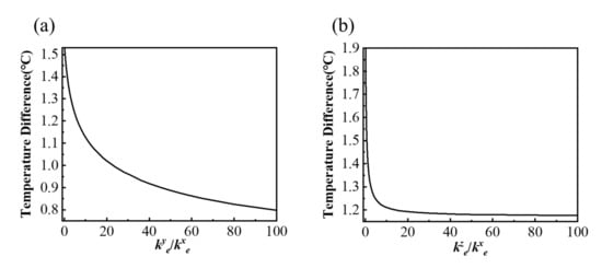 The above research mainly focuses on the orthotropic substrate. In fact, the temperature distribution on the bottom surface of the substrate also depends on the thermal characteristics of the encapsulation. Therefore, the orthotropic encapsulation with different thermal conductivity ratios of key/kex and kez/kex are investigated in Figure 7, where the substrate is selected as the isotropic substrate. It can be seen that the temperature difference decreases with the increasing key/kex and kez/kex, because the improvement of the thermal conductivity of the encapsulation can effectively transfer heat to the top layer, thus reducing the heat flow in the substrate, which can help improve the uniform temperature of the bottom surface on the substrate. Additionally, the thermal conductivity kez in encapsulation has a greater impact on the temperature uniformity on the bottom surface because the temperature difference falls faster than that with key, as shown in Figure 7.