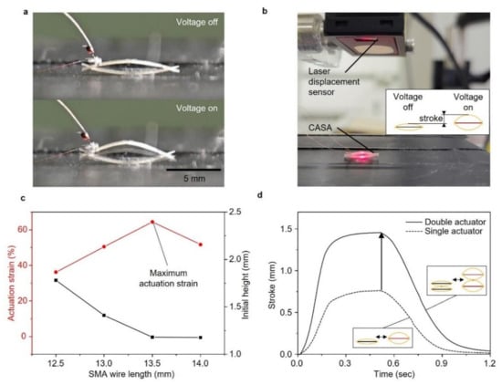 The compliant structure of the CASA amplified small strain (3~4%) of the SMA wire when the voltage was applied, as shown in Figure 3a. Previous research [21] on the CASA demonstrated that a prestrain of SMA wire and initial height of assembled elastic beams determined the actuation strain of the CASA. Highest actuation was achieved with these two key parameters. First, the prestrain of SMA wire in an elastic deformation and the actuation strain of the SMA wire in the horizontal direction were in a proportional relationship. A short SMA wire resulted in the high prestrain caused by bending force of the compliant beams; thus, the high actuation strain. The second parameter was initial the height of compliant beams. The low initial height induced high incremental ratio of the vertical-to-horizontal displacement. A long SMA wire caused the compliant beams to bend with a low initial height; thus, the high amplifying rate. It was important to find the optimal length of the SMA wire for two inversely proportional parameters. We tested four different lengths of the SMA wire to find the highest actuation strain of the CASA.