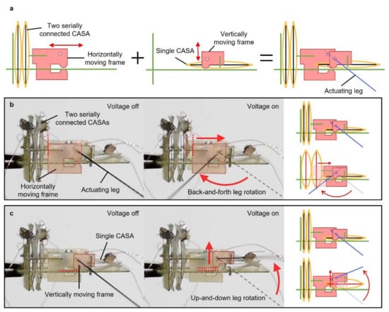 Separate or simultaneous motions of the water strider’s middle legs enable the water strider to move forward or to turn. The robot had four actuators (two single and two stacked CASAs) to create the separate sculling motion of each actuating leg. Figure 4 shows a side view of the robot. There were two different sets of an actuator and moving frame designed to move in two different perpendicular directions, as shown in Figure 4a. The actuating leg was placed through two holes of two moving frames. Each moving frame was designed to move only in one direction different from each other, in the horizontal and vertical direction. The actuating leg rotated back and forth as the horizontally moving frame moved and the other vertically moving frame was, fixed serving as a pivot (Figure 4b). To move the horizontally moving frame, two serially stacked CASAs were connected to the moving frame. Figure 4b demonstrates how the actuating leg rotated up and down. The single CASA was connected to the vertically moving frame. As the vertically moving frame was moved by the single CASA connected to vertically moving frame, the actuating leg rotated up and down with the horizontal moving frame fixed. At each side of the robot, the horizontally and vertically embedded actuators could perform the motion with 2 degrees of freedom. Since the actuators at each side were separated, the total degree of freedom of the robot was 4. The back-and-forth rotation angle was designed about two times higher than the up-and-down rotation angle to achieve similar elliptical trajectory of the leg of a real water strider. The combination of rotation of the actuating leg in two different directions created the sculling motion explained in detail in the Section 3.