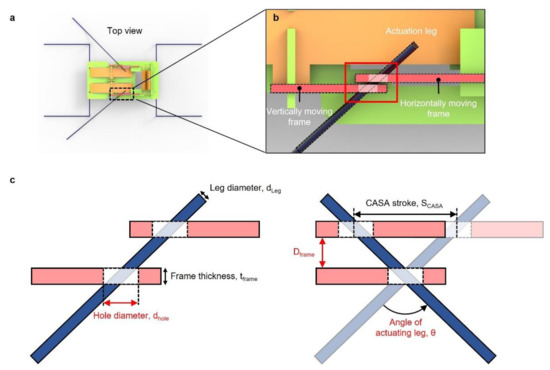 where is the thickness of the frame (0.2 mm), is the diameter of the actuating leg (0.2 mm), is the stroke of the CASA (1.456 mm) and is the desired angle of the actuation leg (80°), as shown in Figure 5c. and were calculated to be 0.429 mm and 0.6676 mm, respectively.