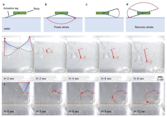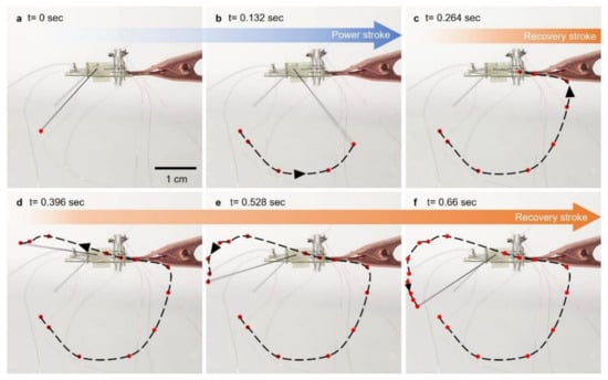 (a–f) Photo snapshots of rowing actuating leg trajectory in the air.