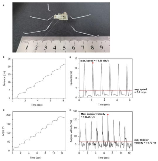 The distance and the speed of the robot moving forward were measured, as shown in Figure 8. The robot was 9 cm long, as shown in Figure 8a. The robot could move a distance of approximately 5 cm per stroke with the maximum and average speed of 14.26 cm/s (1.56 body length (BL) per second) and 2.8 cm/s (0.31 BL per second), respectively, as shown in Figure 8b,c. Even though a thin copper wire with a diameter of 0.01 mm was used for the electric connection, the wire interfered with the motion of the robot, reducing its speed due to the light weight of the robot. The turning, angle and maximum angular velocity of the robot were also measured (Figure 8d,e). The robot could turn approximately 20° per stroke with a maximum and average angular velocity of 145.05°/s and 14.72°/s, respectively.