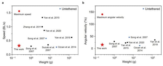 We also compared the performance of our robot with other water-walking robots (Figure 9a,b). The current prototype exhibited a comparatively light weight (0.236 g), maximum speed (1.56 BL/s) and angular velocity (145.05°/s) and an average speed (0.31 BL/s) and angular velocity (14.72°/s). The use of the SMA wire and simple structure for the sculling motion reduced the weight of the robot. Including only four thin supporting legs to support its light weight reduced the resistance to motion. The SMA is known to actuate under low frequency compared to other types of actuators. Even though the time for a cycle of SMA actuation was long due to its cooling (recovering) time, the heating time could be greatly reduced by applying a high voltage. Thus, the robot utilizing the CASAs had the advantage of generating a highly propulsive energy in a short time, resulting in the high maximum speed. However, the robot’s average speed was comparatively low due to the long cooling time (low frequency) of the SMA wire. The untethered robots noted as a blue dot in Figure 9 were also proposed, weighing 6.13 g and 21.75 g. Our robot was expected to weigh less than 1 g with a battery and electronics to control the robot with on-board power.