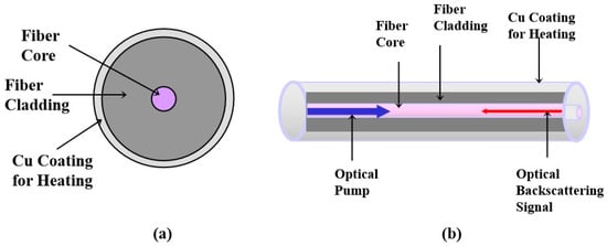 (a) Cross-section of the sensing fiber. Cu coating encapsulates the fiber cladding and core. (b) Optical Rayleigh backscattering in the optical fiber. The optical pump generates the optical backscattering signal through the Rayleigh process. The optical backscattering signal is sensitive to the fiber temperature.