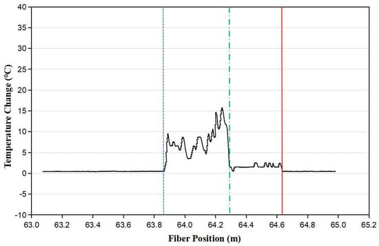 The sensor clearly distinguished the boundary between the liquid nitrogen and nitrogen vapor. The dashed green line indicates the boundary between the nitrogen vapor and liquid, which was located at ~64.30 m with reference to the original point of the OBR4400 unit. The sensing fiber was located between the dotted blue line and the solid red line.