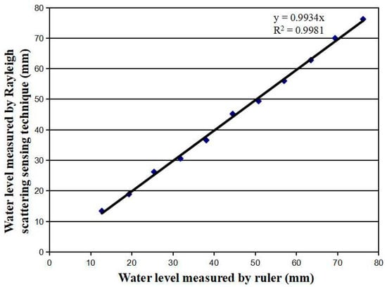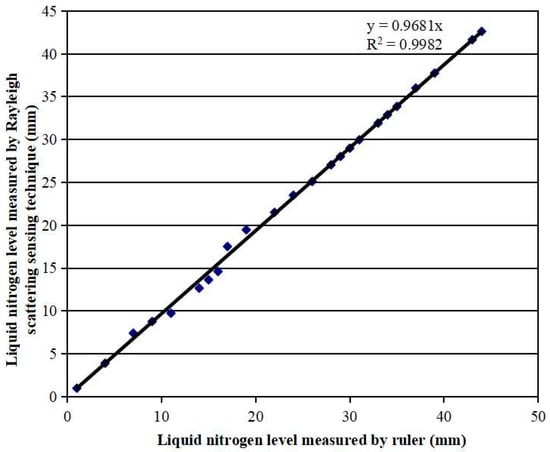 To demonstrate that the fiber sensor was able to measure the liquid nitrogen level with a 1 mm spatial resolution, we mounted a ~300 mm long sensing fiber on a ruler. The ruler was then fixed vertically in an open cooler with a ~200 mm height and ~150 mm inside diameter. Liquid nitrogen contained in the cooler evaporated gradually at room temperature. The liquid nitrogen level was simultaneously measured by the fiber sensor and by the ruler, as illustrated in Figure 1a. The sensing fiber was heated with a 200 mA electrical current. The liquid nitrogen level measured by both the fiber sensor and the ruler is shown in Figure 4. The fiber sensor measured the liquid nitrogen level as accurately as the ruler with a correlation factor of 0.9982, which proves that the fiber sensor has a 1 mm spatial resolution, the same as the ruler.