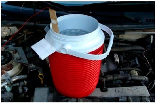 It is commonly known that performance of C-OFDR-based optical fiber sensors can be influenced adversely by temperature and strain changes in ambient environments [23]. The optical fiber liquid sensor can distinguish the temperature difference between the fiber segments submerged in liquid and those outside the liquid and determine the interface between the liquid and vapor. As the sensor detects the temperature difference instead of measuring the absolute temperature along the sensing fiber, the liquid level measurement is not affected by the temperature fluctuation in ambient environments. Hence, the following experiments were focused on investigating the influence of strain change, i.e., vibration, on the sensing performance. Due to safety concerns, we used the fiber sensor to measure the water level instead of liquid nitrogen while a container was placed on a running car engine, as shown in Figure 5. We used a CSI 2120 vibration analyzer made by Emerson Process Management to the measure vibration at the container location. Figure 6 shows the vibration spectrum with a 0.477 inches/second peak velocity at a frequency of 1408.6 cycles per minute.