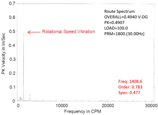 Car engine vibration spectrum at the container location with a 0.477 inches/second peak velocity at the frequency of 1408.6 cycles per minute.
