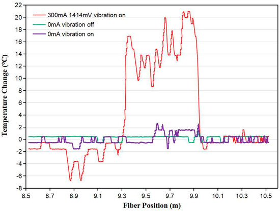 Firstly, we investigated the noise level of the fiber sensor without and with engine vibration. A 0.6 m long sensing fiber was spliced with a ~9 m long telecom fiber SMF28, which was connected to the OBR 4400. When the car engine did not vibrate, the maximum temperature fluctuation, i.e., the maximum noise, along the optical fiber was about ~1.0 °C, as shown by the green line in Figure 7. When the car engine vibrated, the purple line in Figure 7 shows that the maximum noise induced in the fiber was ~5.0 °C, which was repeatedly measured several times. Therefore, as long as the electrical current flowing along the metal coating raises the fiber temperature above 5.0 °C, the sensor is able to distinguish the water level. We heated the sensing fiber with a 300 mA current while the car engine was running. As shown by the red line in Figure 7, the temperature of the sensing fiber, located from 9.33 m to 9.93 m with reference to the original point of the signal interrogation unit, increased by ~9 to 21 °C. The temperature increase was significantly larger than of the noise level (5.0 °C) with the car engine vibrating. Thus, the temperature changes and locations of the sensing fiber could be accurately measured by the signal interrogation unit regardless of vibration.