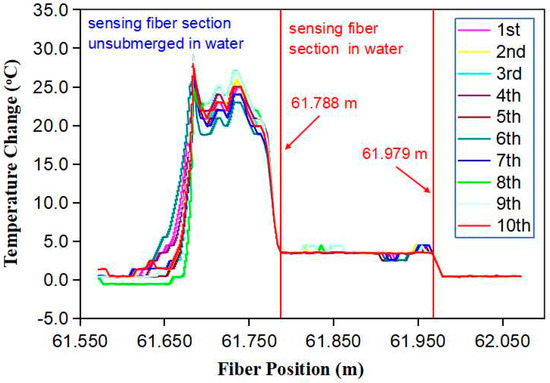 Finally, we examined the repeatability of the fiber sensor measurement. A 0.35 m-long sensing fiber was connected to OBR4400 via a ~60 m-long telecom fiber SMF28. A sensing fiber segment that was about 0.19 m long was submerged in water while the rest remained outside of the water. Figure 9 shows 10 consecutive measurements of the temperature change along the sensing fiber made every 10 min when the fiber was heated electrically with a 400-mA current. The heated fiber was located from 61.65 m to 61.979 m away from the OBR4400. The temperature of the fiber segment outside of the water, which was located from 61.65 m to 61.788 m, was increased by ~20 °C. The temperature of the fiber segment submerged in water, which was located from 61.788 m to 61.979 m, was increased slightly by ~4 °C. For the 10 measurements, in spite of the small variation from one measurement to another, the interface between the air and water was identical at 61.788 m with reference to the original point of OBR4400. Hence, the optical fiber liquid sensor was able to determine the liquid level consistently.