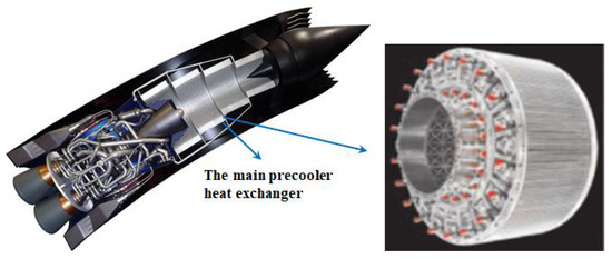 During the exploration of hypersonic power, the development route of the combined-cycle power system is highly feasible, which is one of the most prospective propulsion systems in the future [1]. The high temperature of inflow air caused by hypersonic flight is a fundamental reason to limit the development of hypersonic power [2]. With the flight Mach number increasing, the stagnation temperature of air flow raises rapidly. High inlet temperature results in excess compression work and overhigh temperature at the compressor outlet, seriously limiting engine performance [3]. The hypersonic precooled engine is a potential propulsion system for hypersonic flight and space access, which can efficiently operate over a wide range of Mach numbers [4]. The research of precooled air-breathing engines with a precooler as the core component has become one of the main directions of hypersonic power exploration. By installing a precooling heat exchanger or jet precooling device at the engine inlet, as shown in Figure 1 [5], the thrust-to-weight ratio of the engine can be improved significantly, as well as the overall performance of the engine [6]. Therefore, the precooling air-breathing technique has become a study focus in the aerospace field.