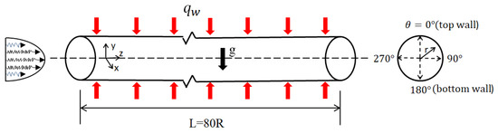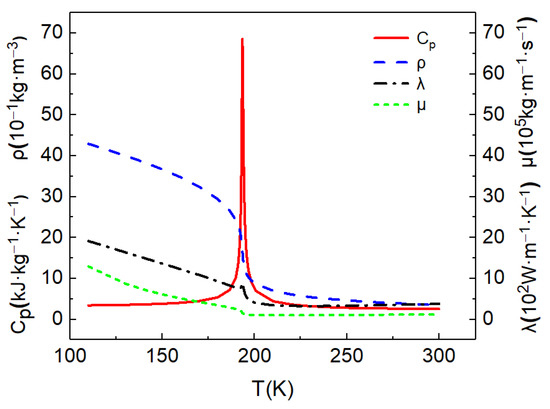 The computational mode was a horizontal micropipe with 80R in length (L) and 0.4 mm radius (R), as shown in Figure 2. Cryogenic liquid methane was injected into the tube from the left side at supercritical pressures. The inlet fluid temperature was T0 = 190 K, and the pressure was P0 = 5 MPa. The pipe was heated uniformly in the circumferential direction, and constant wall heat flux was applied. Buoyancy-affected heat transfer at supercritical pressures is an important phenomenon. Therefore, two cases are investigated in this paper, as shown in Table 1, including mixed convection with buoyancy and forced convection without buoyancy. The physical properties of supercritical fluid change dramatically with its temperature and pressure. However, due to the small pressure drop between the inlet and outlet of the horizontal pipe, it is approximately considered that the physical properties of methane are only a function of the temperature. The specific heat capacity, density, thermal conductivity and viscosity of the low-temperature methane at 5 MPa were calculated by the REFPROP software. The physical properties were used to calculate in the FLUENT software by defining a piecewise-linear function of temperature for the properties of supercritical methane. The calculation results were fitted to the physical properties according to the linear interpolation method, and the specific results are shown in Figure 3.