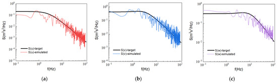 Comparison of the spectra simulated by the DSRFG with the target spectrum. (a) x-axis energy spectrum, (b) y-axis energy spectrum, (c) z-axis energy spectrum.