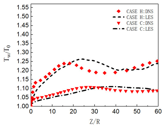 Firstly, the time-averaged results of LES and DNS are compared, as shown in Figure 6. For both cases, the wall temperature is relatively close along the streamwise direction. Although there is a certain deviation in the distribution of wall temperature along the flow direction, it is considered that the different setting methods of inlet boundary may lead to a difference of turbulence intensity in the two flow fields, which affects the heat transfer.