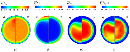 Figure 8 and Figure 9 show the comparison of time-averaged parameters of mixed convection (M) with buoyancy and forced convection (F) without buoyancy. The variables are dimensionless by the corresponding parameters of the inlet. It can be seen from Figure 8 and Figure 9 that the bulk time-averaged parameters of forced convection are uniformly distributed in different sections, and the wall temperature also presents a similar distribution trend along the circumferential direction. At section Z/R = 20, the distribution of time-average parameters of mixed convection is basically the same as that of forced convection. However, there is a local high-velocity region at the top wall of section Z/R = 60 in Figure 8, which is an obvious flow-acceleration phenomenon. The bulk physical properties and wall temperature are nonuniformly distributed in the circumferential direction. Compared with the bottom wall, there is an obvious high-temperature zone at the top wall, which means that the heat transfer decreases.