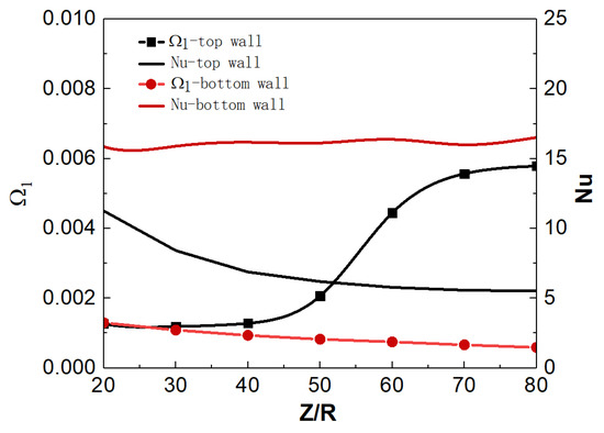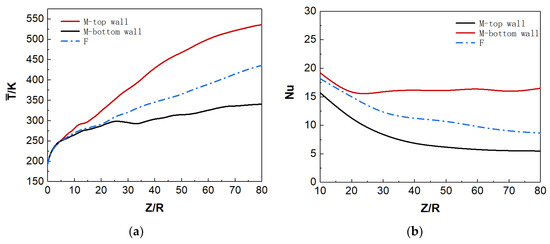 Figure 10a shows the distribution of wall temperature and bulk temperature along the flow direction. For mixed convection, the top and bottom wall temperatures show different trends under uniform-heat flux heating. Before the position of Z/R = 10, the top and bottom wall temperatures have similar trends and values; but when Z/R > 10, the top wall temperature is significantly higher than that at the bottom, and the temperature difference gradually increases along the streamwise direction. On the other hand, according to the local Nusselt number (Nu) distribution in Figure 10b, the Nu of the top wall is small and gradually decreases along the streamwise direction, while the Nu of the bottom wall is relatively large and changes slightly along the streamwise direction. The heat-transfer deterioration occurs on the top wall to a certain extent, and the convective heat transfer is significantly weaker than that at the bottom. In addition, the wall temperature and Nu in the forced convection are between the corresponding parameters of the top wall and the bottom wall in the mixed convection, indicating that the buoyancy has a significant effect on the convection heat transfer, and the effect is different at different spatial positions.