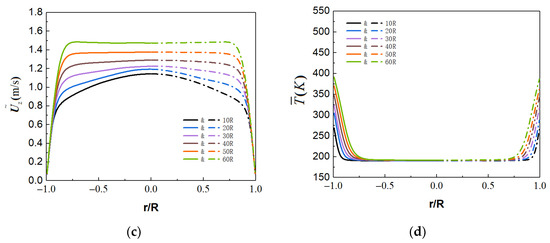 The time-averaged parameter distribution at section Z/R = 60. (a) velocity, (b) temperature, (c) density, (d) specific heat.