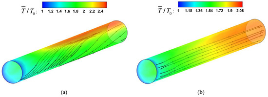 The effect of flow acceleration is typically represented by parameter which is defined as . HE [30] suggests that is a suitable parameter for correlating the data from their convection heat transfer of supercritical fluid. The heat-transfer impairment increases with increasing . For the present simulations, as shown in Figure 13, the Nu decreases with the increase in along the streamwise direction. The increase in represents the enhancement of the flow acceleration effect. It is inferred that the accumulation of low-density fluid at the top enhances the local flow-acceleration effect, which intensifies the local turbulent laminarization, resulting in the weakening of the heat transfer of the top wall. This also explains the reason for the M-type velocity distribution of the fluid at the top wall in Figure 11a. At the bottom wall, Nu increases with the decrease in along the streamwise, but the increase is limited. Under the influence of gravity, the low-temperature and high-density fluid gathers at the bottom wall, and the local flow-acceleration effect is weakened. This process will be beneficial to the enhancement of the convection heat-transfer performance. However, as shown in Figure 12b, the streamlines near the wall are approximately horizontally distributed in forced convection, and the wall-temperature distribution is relatively uniform in the circumferential direction. The effect of buoyancy on the flow structure will be analyzed in the following sections.