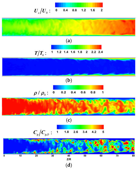 Secondly, Figure 7 shows the instantaneous parameter distribution at the X = 17.5D section of case H by using LES. It can be seen that the fully developed turbulent flow field was obtained. In summary, the method of generating a fluctuating-velocity field according to the target energy spectrum at the inlet boundary and then using it for the large-eddy simulation of supercritical fluid has high calculation accuracy. It has been verified that the results are reliable for LES computations.