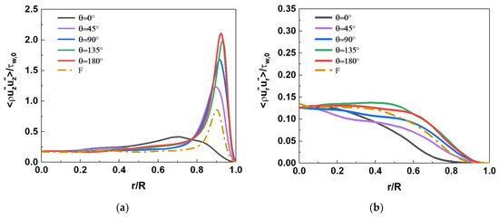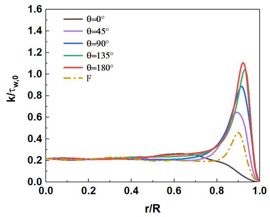 Figure 16 shows the comparison of axial and radial Reynolds stress distribution at section Z/R = 50. In mixed convection, the distribution of axial Reynolds stress is quite different in the circumferential direction. Near the top of the wall (), the axial Reynolds stress decreases sharply, so that the single peak almost disappears. The axial Reynolds stress increases gradually with the downward direction along the circumference. A local peak appears near the wall, and the position of the peak gradually approaches the wall. The axial Reynolds stress reaches its maximum when it reaches the bottom wall (). The radial Reynolds stress shows a similar variation pattern, but there is no local peak near the wall. Compared to forced convection (F), the axial Reynolds stress is enhanced in the range of circumferential angle . The radial Reynolds stress decreases in the range of , while it increases significantly in the range of . It shows that the influence of buoyancy on turbulent motions at different spatial positions is different. It will be further explained in combination with the distribution of turbulent kinetic energy in the following sections.