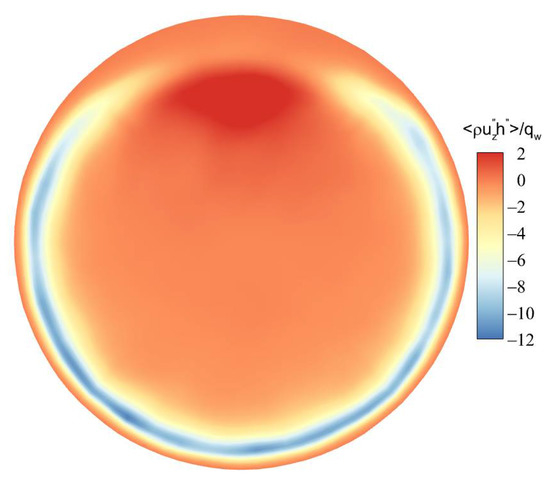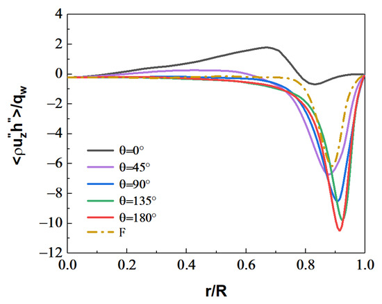 Figure 19 and Figure 20 shows the distribution of turbulent kinetic energy and turbulent heat fluxes at the section of Z/R = 50. The turbulent kinetic energy and turbulent heat transfer are enhanced in the circumferential-angle range of , indicating that the turbulence suppression is mainly concentrated in a certain angle range at the top, rather than intuitively believing that the turbulence of the upper semicircular tube is suppressed and the lower semicircular tube is strengthened. On the other hand, it can be found that there is an obvious positive correlation between turbulent kinetic energy and turbulent heat fluxes. In order to deeply study the interaction mechanism between the two, the relationship between the turbulent burst behavior near the wall and the turbulent heat transfer under the action of buoyancy is analyzed.