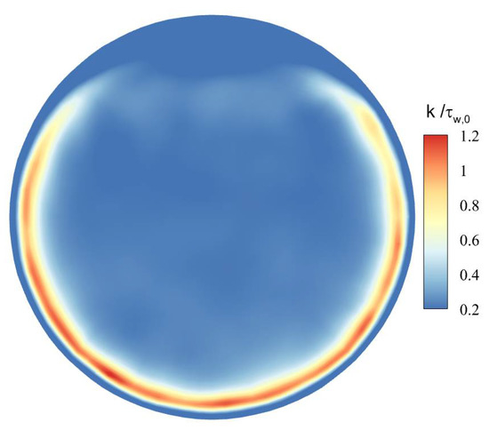Figure 17 shows the distribution of dimensionless turbulent kinetic energy at section of Z/R = 50. For the mixed convection, the turbulent kinetic energy gradually increases from the top wall downward along the circumference, and reaches the maximum at the bottom wall. Compared with the forced convection, the turbulent kinetic energy at the bottom wall of the mixed convection increases to about 2.2 times, while the turbulent kinetic energy at the top wall decreases to 0.5 times.