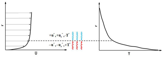 Figure 21 shows the variation diagram of fluctuation velocity and fluctuation temperature corresponding to the average velocity and average temperature distribution near the wall boundary layer, so as to explain the physical process corresponding to the sign of fluctuation velocity and fluctuation temperature. As shown in Table 4, the and heat fluxes are classified into octants according to the signs of the fluctuations of the velocity components and temperature about their respective mean values [31]. It should be noted that the positive direction of is from the center of the pipe to the wall, and the negative direction is from the wall to the center. The turbulent burst behavior near the wall is quantitatively analyzed.