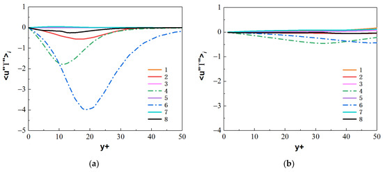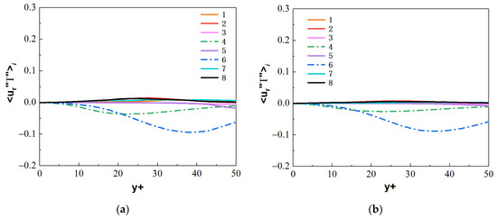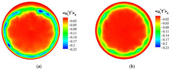 The streamwise turbulent heat fluxes and the normal turbulent heat fluxes at the section of Z/R = 50 are calculated, where the M-type velocity distribution appears. By comparing the values of heat fluxes and from the octants, as shown in Figure A1, Figure A2, Figure A3 and Figure A4, the main turbulent behaviors of the micropipe are represented by octants 4 and octants 6, and the flow behaviors represented by other serial numbers in the octants are weak. Therefore, the turbulent heat-transfer behaviors of the octants 4 and octants 6 are mainly analyzed.