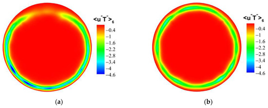 Figure 18 shows the distribution of turbulent heat fluxes along the streamwise direction. The turbulent heat fluxes near the wall have a similar trend to the turbulent kinetic energy near the wall along the circumferential direction. Near the top wall, the turbulent kinetic energy is reduced, and the corresponding turbulent heat-transfer performance is weakened. However, the turbulent kinetic energy reaches a maximum near the bottom wall, and the corresponding turbulent heat fluxes are also the maximum.