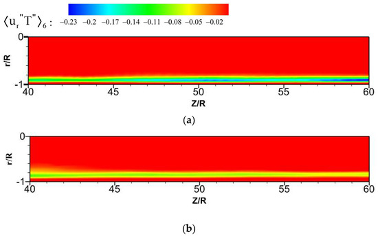 Reynolds stress distribution at the section of Z/R = 50. (a) axial Reynolds stress , (b) radial Reynolds stress .