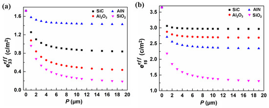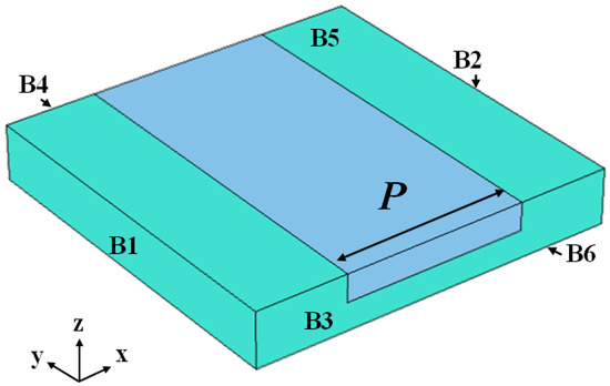 As shown in Figure 1, the RVE consisted of Z-cut LiNbO3 and other materials. Other materials were embedded in the thin LiNbO3 film, and the width of the other materials is expressed as P. Here, four different materials commonly used in MEMS were taken under consideration, including SiC, Al2O3, AlN and SiO2. The boundary conditions applied to the six surfaces of the RVE are in the form of prescribed displacements and prescribed electric potentials. For calculation of the piezoelectric coefficients and , the boundary conditions applied to the six surfaces and the postprocessing steps for assessing the piezoelectric coefficients and are listed in Table 2. In Table 2, u, v, and w are the displacement components along the x-, y-, and z-coordinate axes, respectively, and V0 is the applied electric potential.